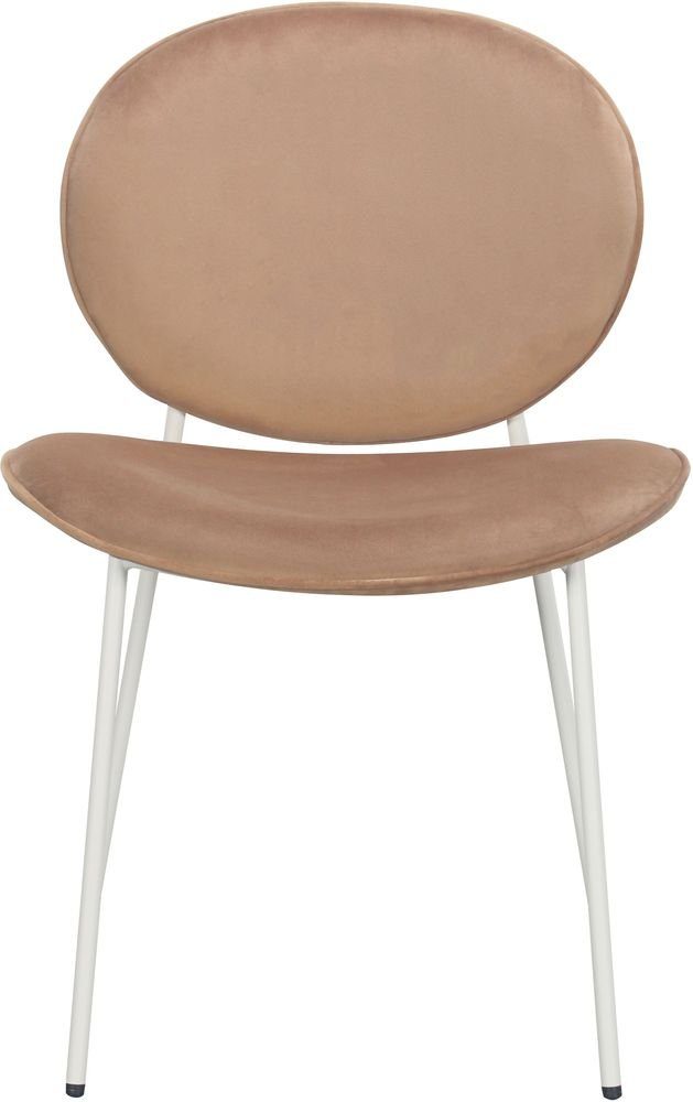 Modern stol klädd i ett ljusbrunt sammetstyg, matt vita ben av metall. Serien innehåller stolar i fler färgkombinationer.