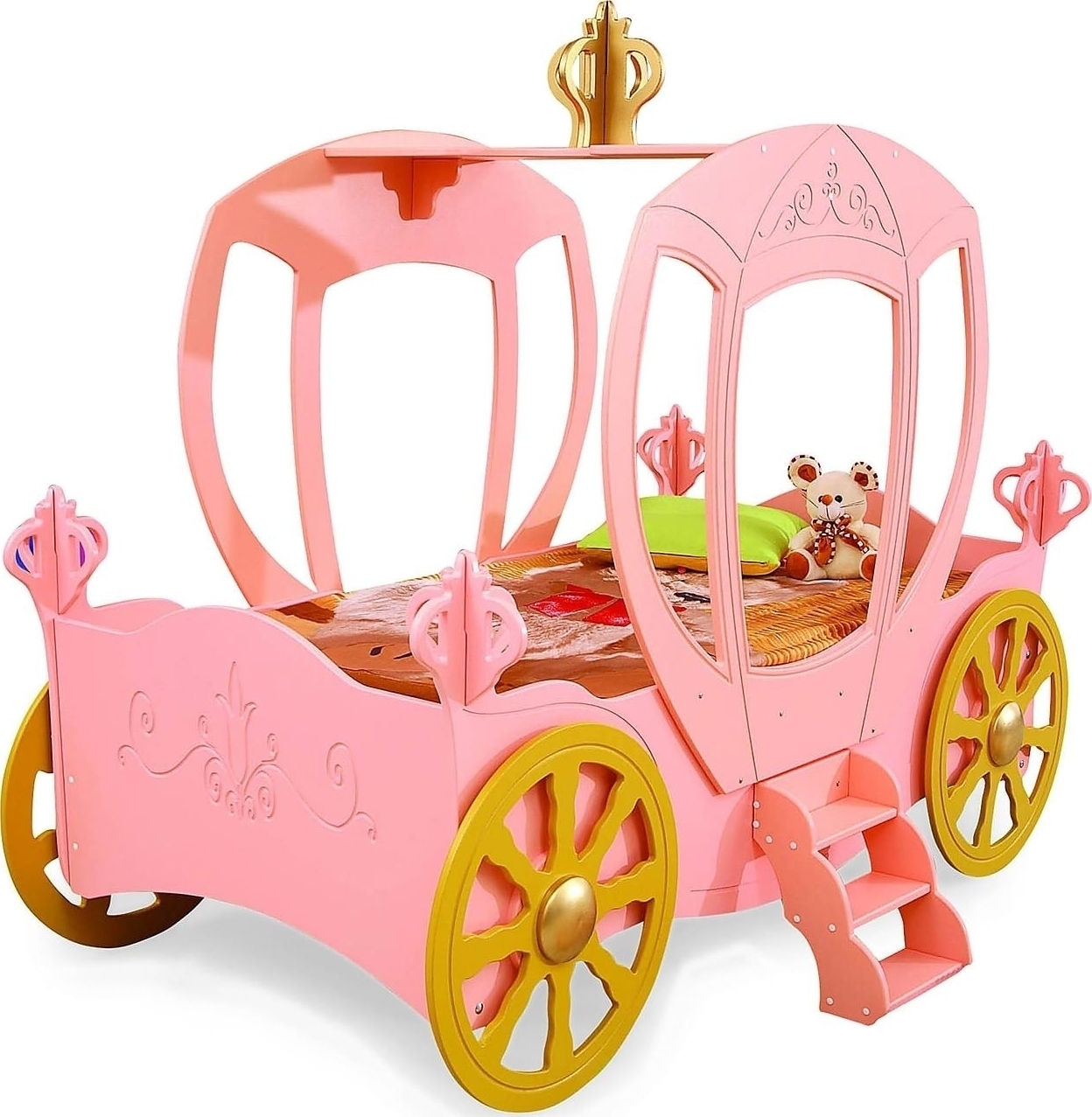 Väldigt dekorativ och piffig barnsäng i rosa och gult med trappa, ståendes på hjul. En säng som kan lysa upp ett rum på ett sagolikt sätt och sätter sprätt på barnens fantasi. Lek och sov som en prinsessa.