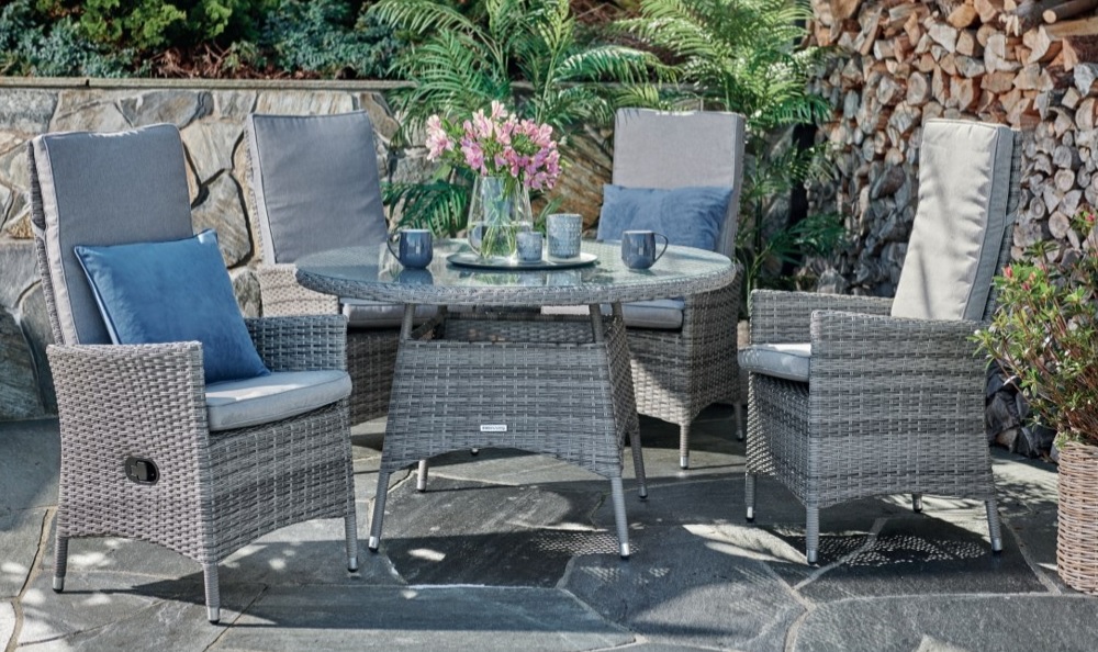 Easy Living By Martinsen, Rosenbad är en lyxig och snygg matgrupp i grått utförande. Matgruppen består av 4 st komfortabla fåtöljer som är ställbara och ett stort rund matbord. Gruppen är tillverkad i aluminumstomme med dubbel halvrund rotting för att ge en exklusiv känsla och lyxigt utseende. Dynorna i grått vädertåligt tyg.