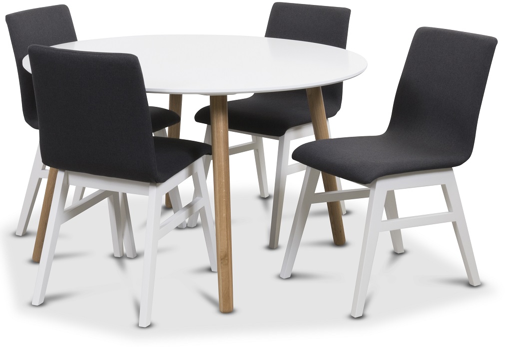 Matgrupp från Skånska Möbelhuset, Klassiskt runt matbord Rosvik 120 cm diameter med vitlackad toppskiva och ekben samt Fyra stycken Molly stolar i mörkgrått tyg med vita ben som ger ett modernt intryck!