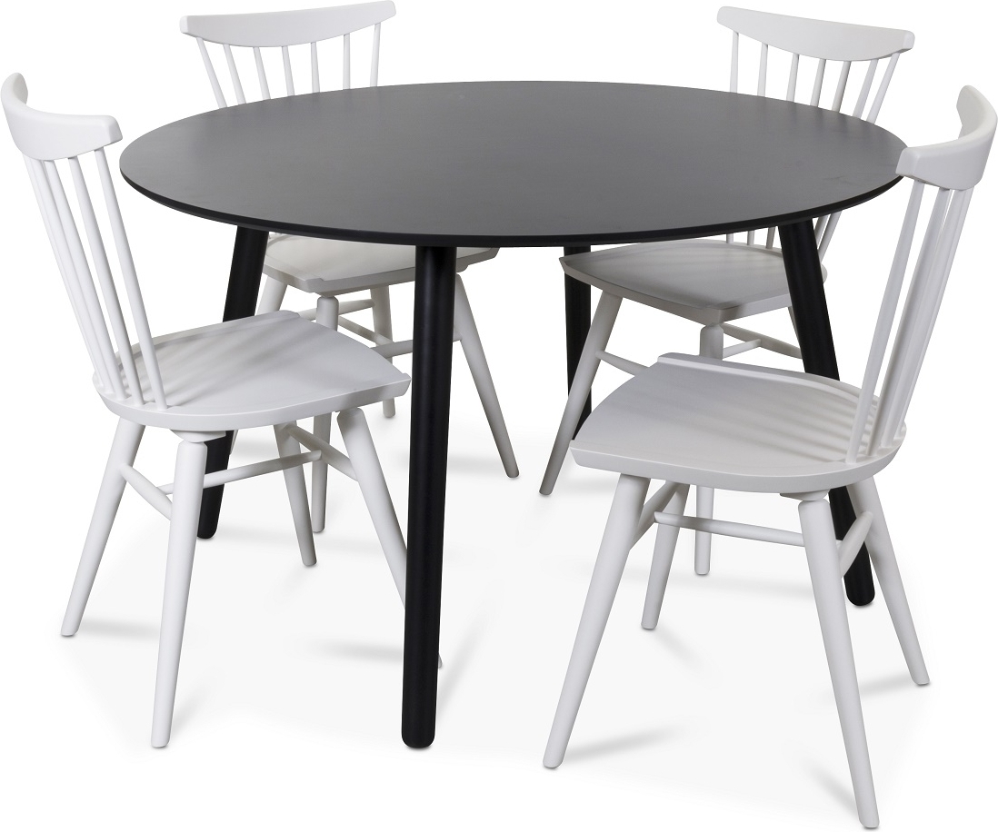 Rosvik matgrupp runt svart matbord med 4 st Thor pinnstolar- Svart / Vitt