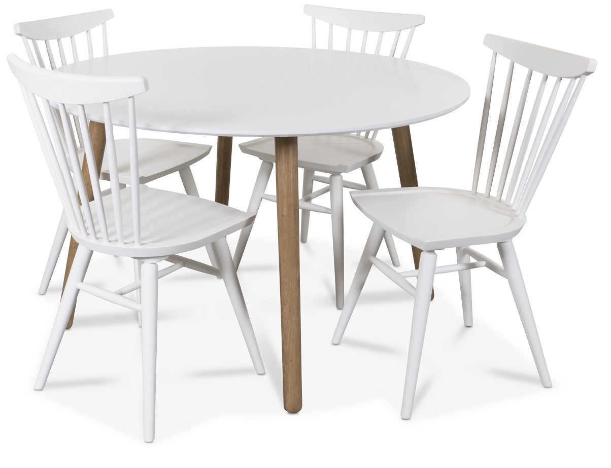 Matgrupp från Skånska Möbelhuset, klassiskt runt matbord i vit/Ek med fyra stycken Thor pinnstolar i vit lack.