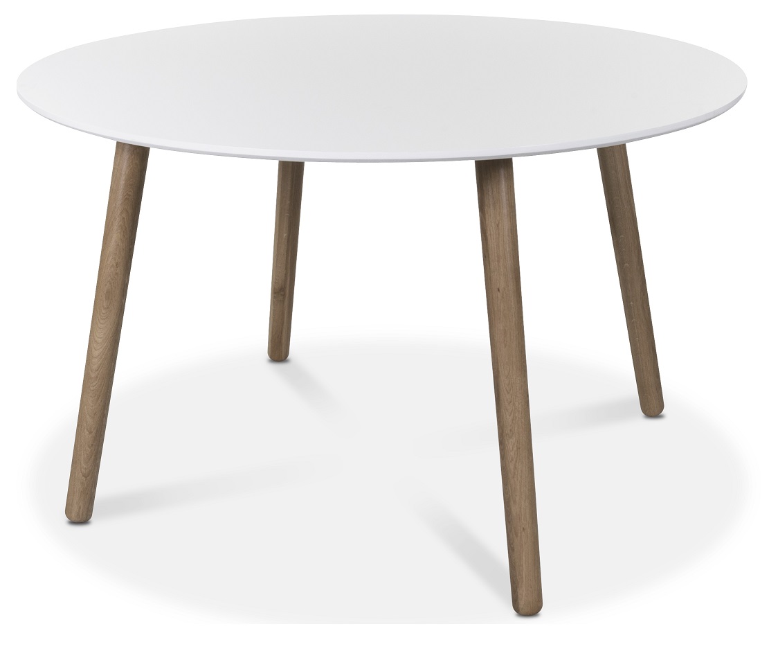 Ett runt matbord 120 cm i diameter med toppskiva i vitlackat trä och runda massiva ek-ben. Detta bord passar in i de flesta miljöer med sitt stilrena formspråk!