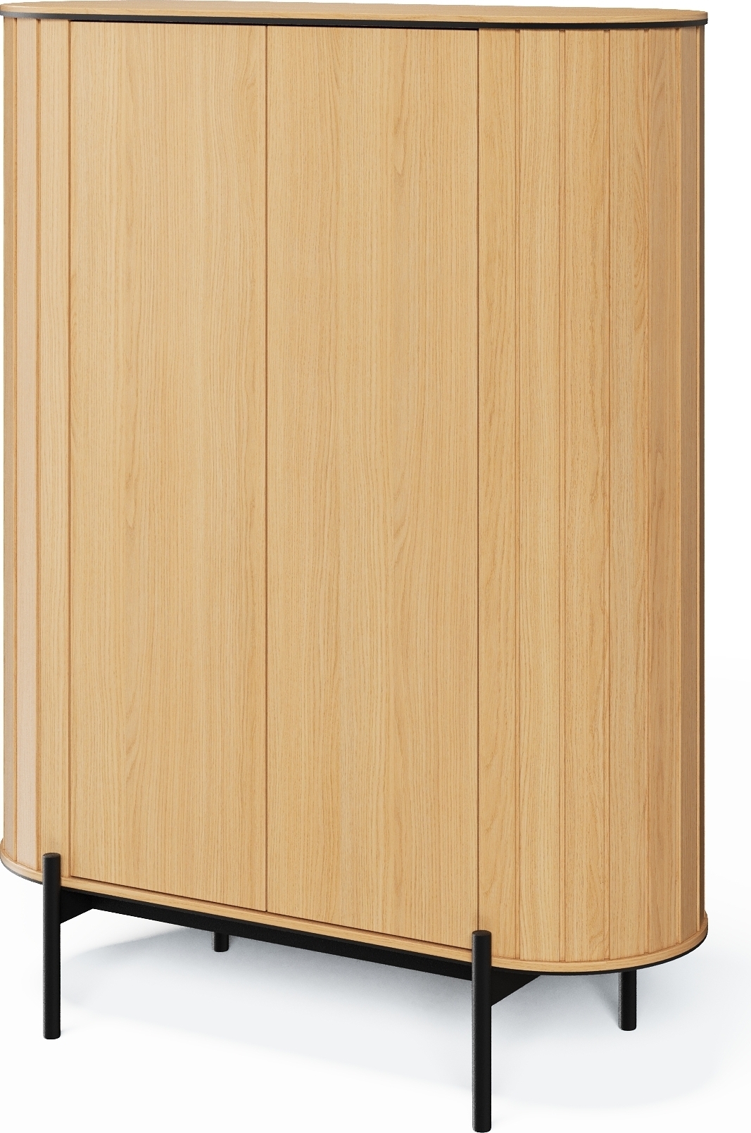 Skåp av laminerad spånskiva med ben av metall. Den rundade exteriören i ljus ekimitation bärs upp av ett svart metallunderrede som underlättar städningen. Insidan är indelad i 2 sektioner med 4 förvaringsfack var och är målad i eukalyptusgrönt. Levereras omonterad.