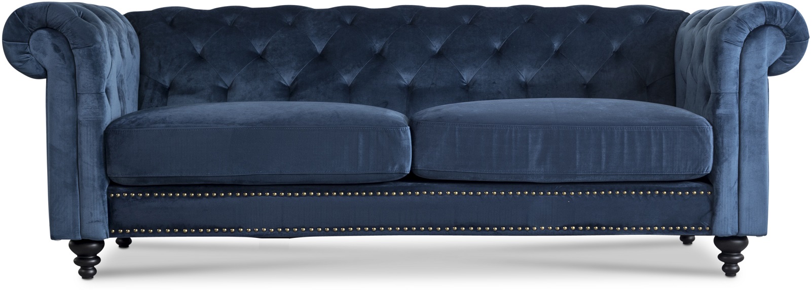 Chesterfield Royal 3-sits soffa i ett mörkblått mjukt och skönt sammetstyg, med härlig komfort och god kvalite. Sittdynorna innehåller kallskumstoppning med duntopp för lång hållbarhet. Soffan är plan på baksidan vilket gör den perfekt att ställas mot en vägg. Svarta svarvade träben. Antikfärgade nitar som en decoration på soffans framsida.