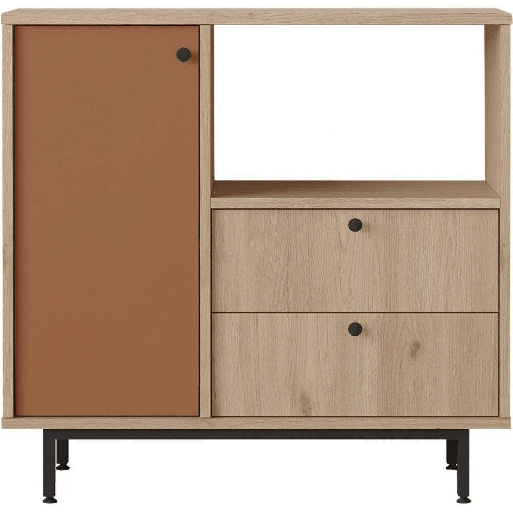 Skåp av melaminbelagd spånskiva med ben av metall.