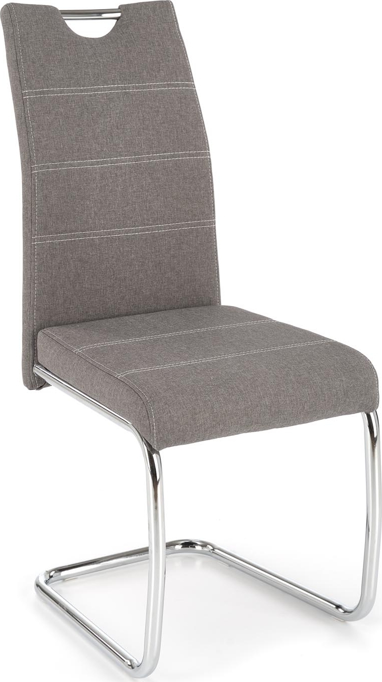 En fin matstol med en modern design. Stolen är klädd med ett mycket behagligt tyg för maximal komfort och underredet är av kromad metall.