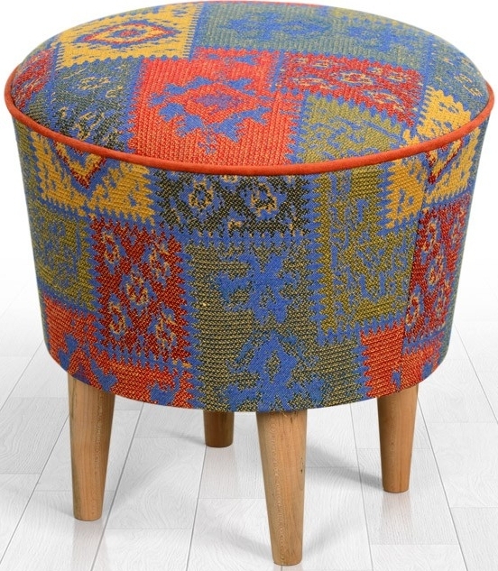 Sittpuff av trä. Klädd med polyester. Stoppning av skum.