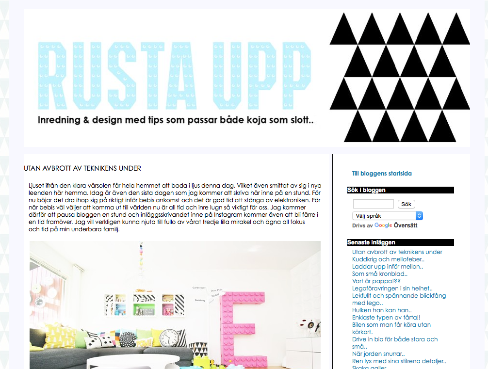 RUSTA UPP är en blogg om ett lekfullt hem med mycket färger och vitt som bas den är även en liten tidsresa där man får se hemment växa fram och förändras. Det är inte bara en inredningsblogg utan också en livstilsblogg med familjetema man kan hitta roliga och kreativa recept till barnmat, fina barnkalasidéer med olika teman och hur man skapar dem. Lekfullheten tar sig uttryck i DIY i både stort och smått t ex en front av legobitar till badrumsskåpet, en fantastisk fin våningssäng i barnens rum och en härlig tavelvägg i hallen och godissuschibitar. Baksidan av familjens hus är ett färglatt lekparadis för barn, framsidan är inte mindre fixad där hittar man trädäck och pooler. Isabella delar också med sig av bilder på de hem och inredningar som inspirerar henne själv och inredningar som hon gjort åt andra.