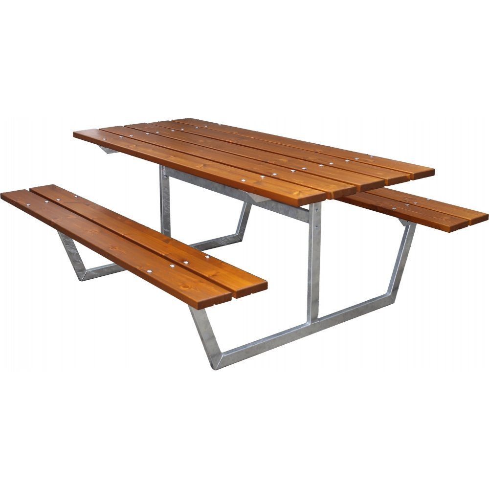 Rejäl konstruktion, kraftiga rör och brädor. Ett bänkbord som kräver minimalt med underhåll. Picknickbord Rustik passar i de tuffaste miljöer, samtidigt som den är lätt att underhålla. Bord med fasta bänkar i ett och plats för 4 personer. Ett bra val för rastplatser, parker och uteplatser med mycket aktivitet. Levereras omonterad.