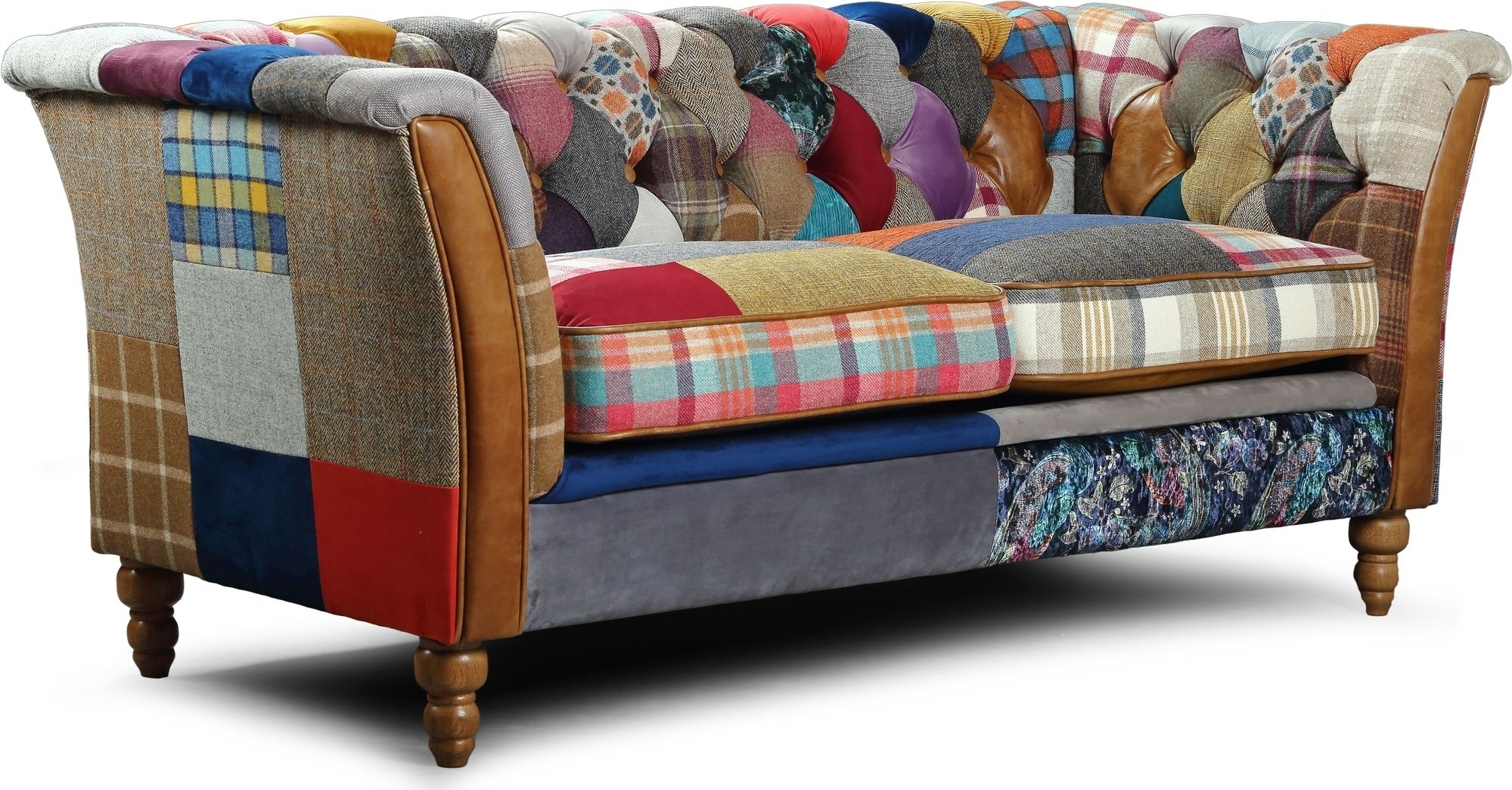 Ruthin 2-sits soffa i patchwork-tyg med bruna svarvade träben. Finns även som 3-sits.