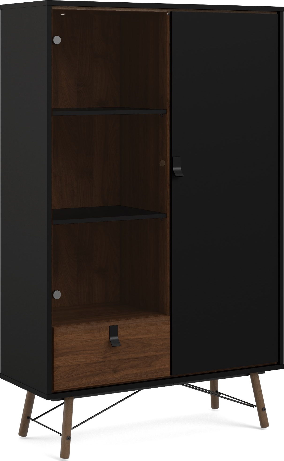 Vitrinskåp av spånskiva med ben i massivt bokträ.