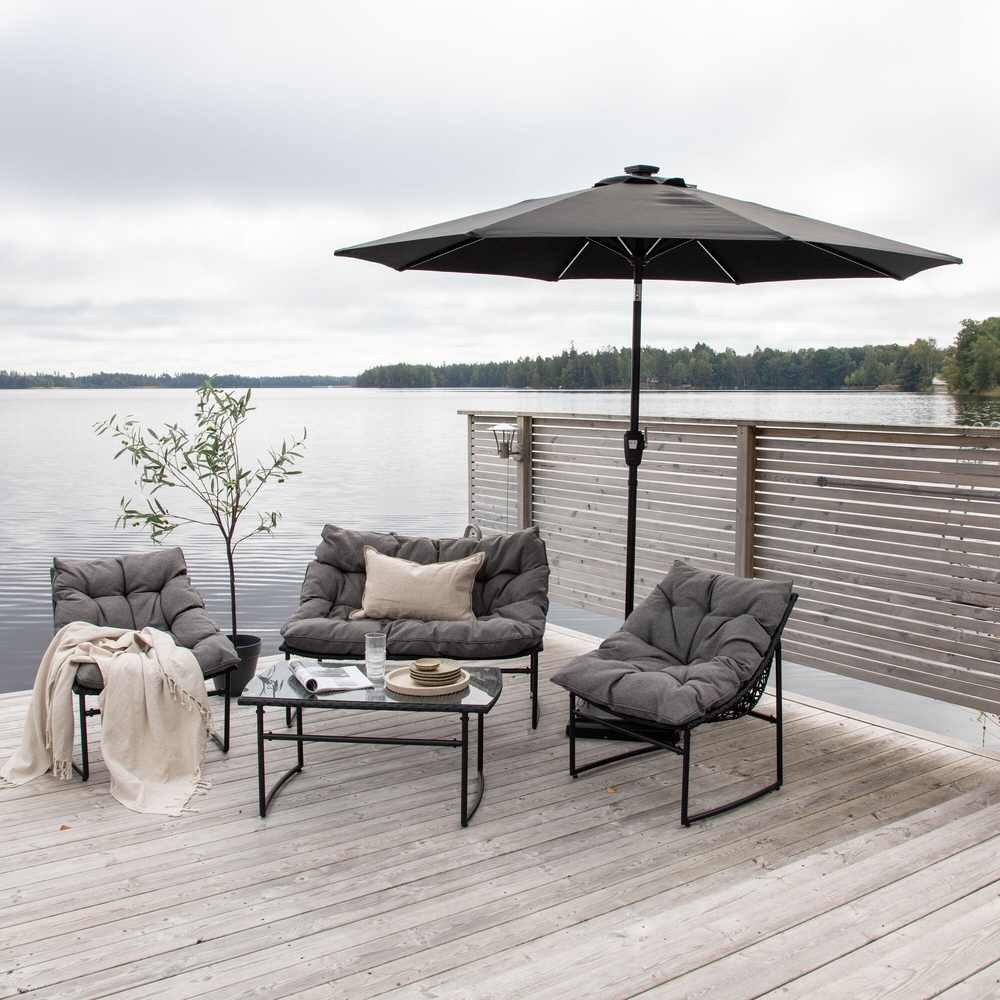 Ett fristående parasoll med svart tyg, perfekt för lata dagar i skuggan! Flytta runt det på din uteplats efter ditt behov. LED-belysningen ger ett mysigt sken på kvällarna. Mått: 270 cmSkötselråd:För våra parasoll rekommenderar vi att man använder sig av parasollskydd. Dra på överdraget när parasollet inte används, det mot sol och minskar därmed risken för solblekning. Överdraget används när parasollduken är torr, annars finns det risk för mögel. Lämna aldrig ett parasoll uppfält när det inte används. Hängparasoll är många gånger känsligare för vindar än vad traditionella parasoll (med pelaren mitt under duken) är.