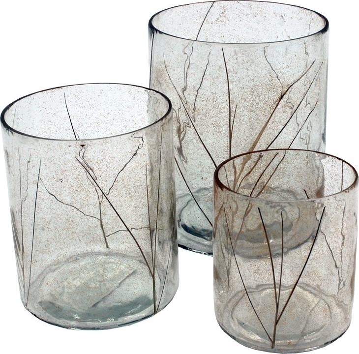 3 st ljuslyktor av glas. I glaset är torkat gräs instansat i mjuka naturliga beigea och bruna toner. Glaset har ett guldigt skimmer i sig.