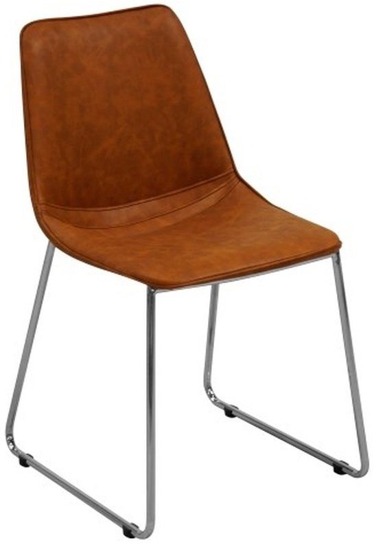 En stilren, klassiskt designad stol med många användningsområden, t.ex till matbordet med benen är av kromad metall och sitsen är klädd med konjak brunt konstläder (PU).