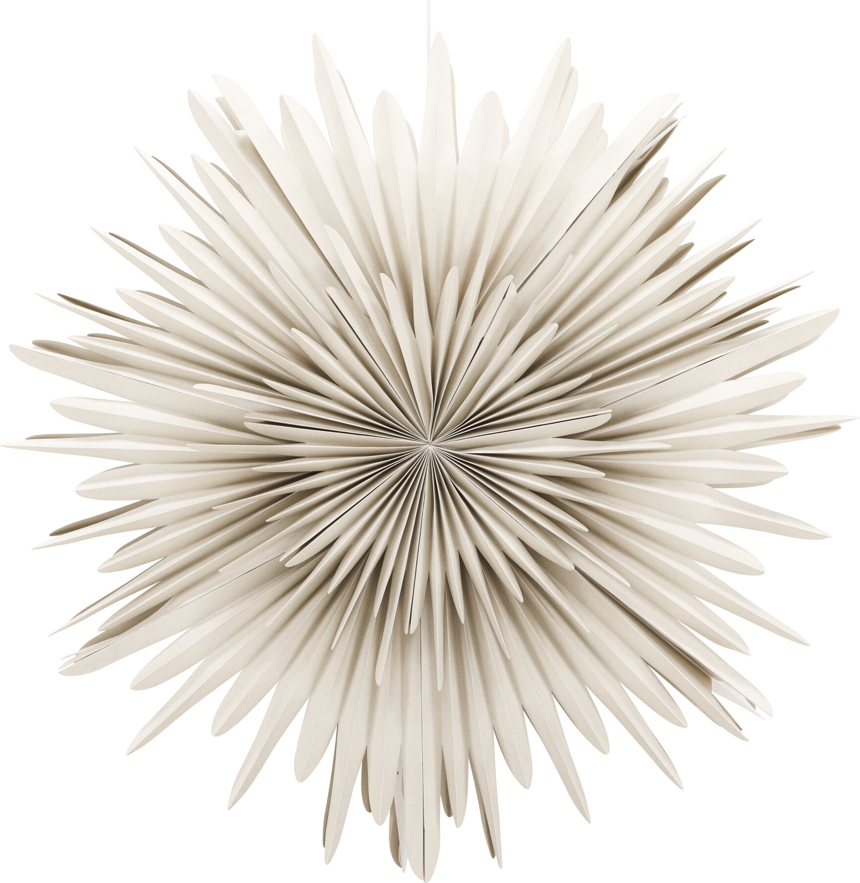 Få till den där mysiga känslan i hemmet med hjälp av en pampig och stor pappersstjärna i krämig beige kulör som skapar ett mysigt sken i ditt hem! Vår vackra taklampa från serien Sälen är utformad som en flerdimensionell pappersstjärna i beige papper. Tack vare dess flera lager så skapar den här lampan en vacker dimension till rummet och får ett stilrent djup i sig själv. En perfekt inredningsdetalj helt enkelt. Den diskreta vita sladden smälter elegant in i helheten och bidrar till att skapa en stilren och sofistikerad belysningsanordning. Sälen passar perfekt för att lysa upp dina höstmörka dagar och för att skapa den perfekta atmosfären när julens högtidliga stämning kryper fram. Häng den i sovrummet för att skapa en lugn och avkopplande atmosfär, placera den i köksfönstret för att skapa en mysig stämning eller använd den inne i vardagsrummet för att ge rummet det där extra magiska touchen. Sälen finns i flera olika storlekar och färger, vilket gör det möjligt för dig att välja den som passar bäst för ditt rum och stil. Varje storlek har sin egen charm och unika karaktär, men oavsett vilken du väljer kan du vara säker på att du får en belysningslösning som kommer att vara perfekt för just dig! Mått: 100cm.