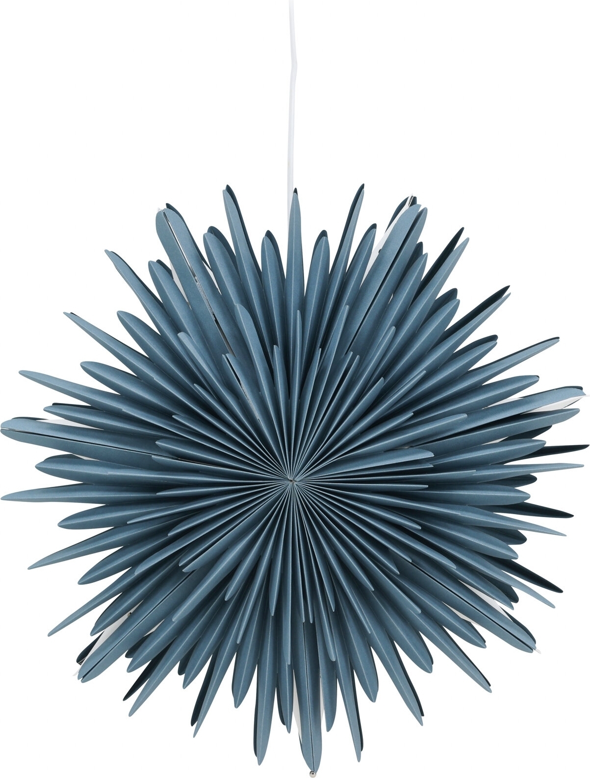 Med taklampan Sälen kan du skapa en varm och mysig atmosfär både under vinterns och höstens mörka dagar samt under julens högtidliga firande. Denna grå/blå pappersstjärna, formad som en blommande stjärna i havets nyanser, kommer definitivt att imponera på dig och dina gäster. Sälen är tillverkad av flera lager vikt papper, vilket ger en harmonisk och behaglig belysning samtidigt som den skapar ett vackert djup i rummet. Den diskreta vita sladden gör att lampan smälter in naturligt i vilket rum som helst. Välj mellan olika färger och storlekar för att hitta den perfekta Sälen-lampan som passar ditt hem bäst. Oavsett om du föredrar en subtil touch av blå nyanser eller en mer stilren färgkombination, kommer Sälen att sprida värme och mys i ditt hem! Mått: 46cm.