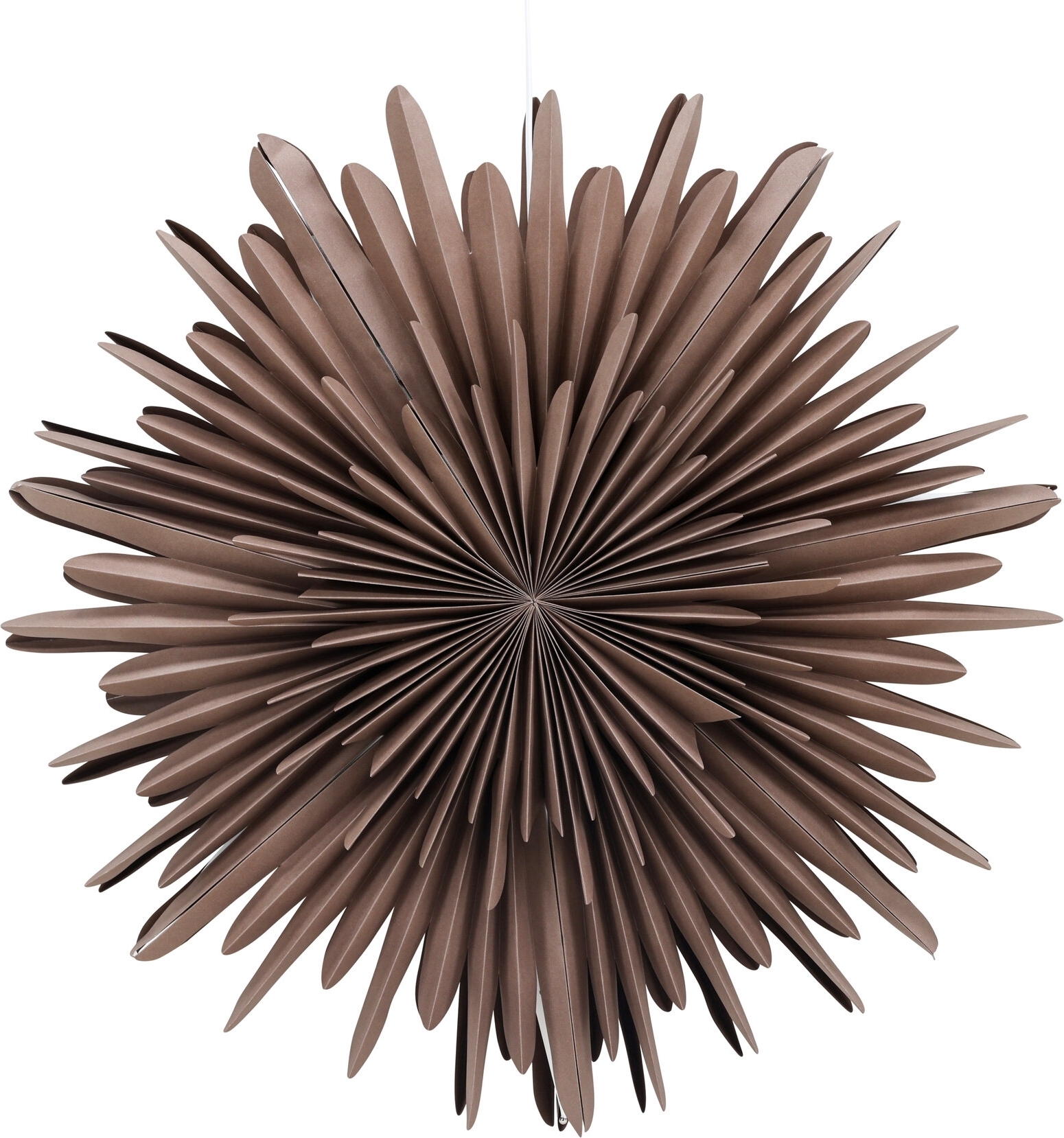 Inred ditt hem med varmt ljus under kalla vinterdagar med hjälp av vår pappersstjärna i greige färg från serien Sälen! Den här taklampan är formad som en blommande stjärna som sprider ett magiskt sken och mysiga känslor när det behövs som mest. Kulören drar mot den mörkbruna färgen men har även toner av lite grått och beige i sig. Den vita sladden som håller lampan på plats ger en diskret och stilren anordning, så att din belysning kan ta centrum i rummet. Oavsett om det är vinterns och höstens mörka dagar eller julens högtidliga stämning, kommer denna pappersstjärna att skapa en underbart mysig och rofylld atmosfär. Sälens blommande pappersstjärna finns i olika färger och storlekar, så att du kan välja det som passar dig och ditt hem bäst. Skapa en personlig touch och inred ditt hem på ett sätt som får dig att känna dig lugn och omfamnad! Mått: 80cm.