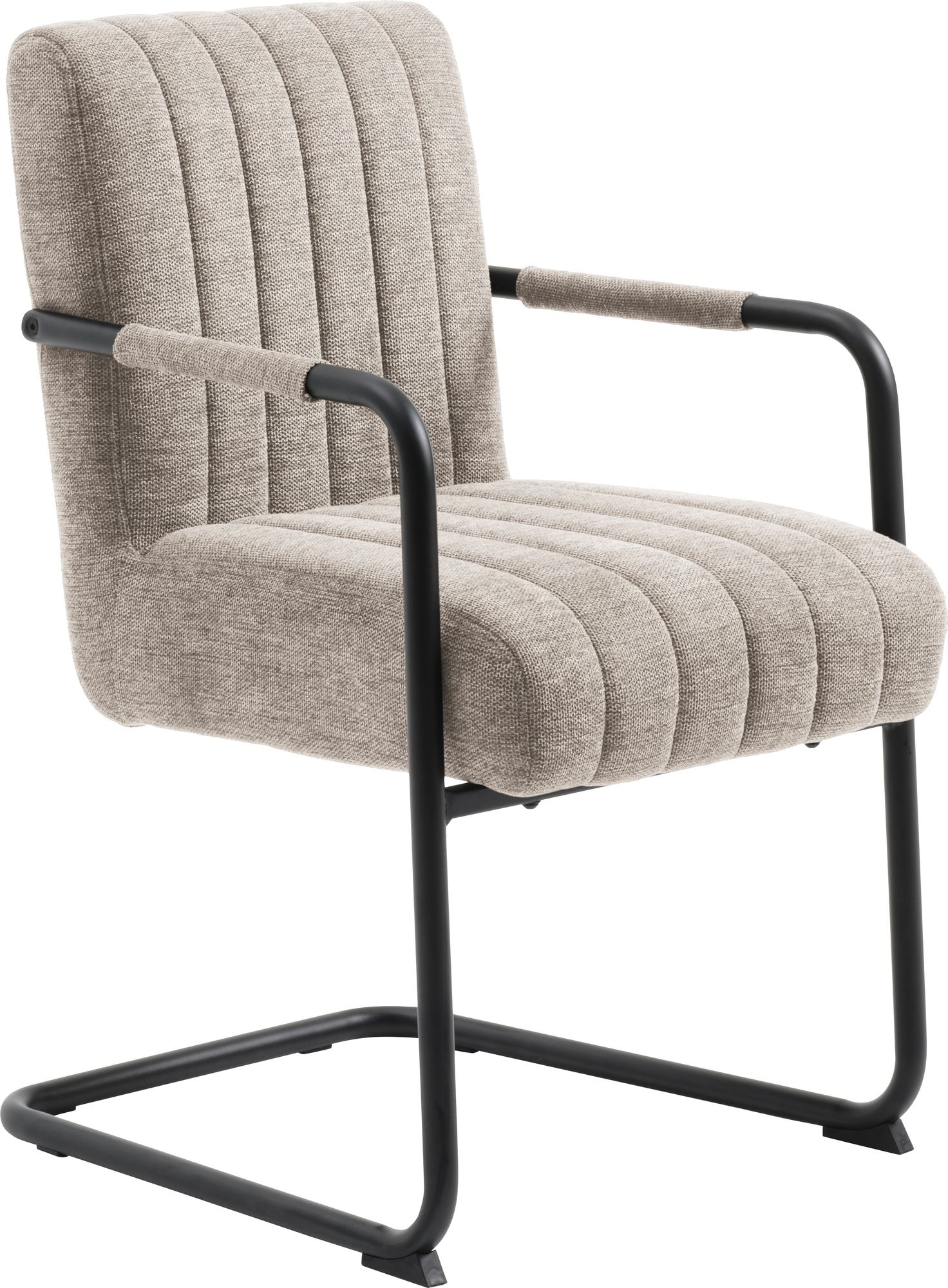 Eleganta karmstol som är designad för att förena stil och komfort. Denna stol är klädd i ett sandfärgat tyg som ger en varm och inbjudande känsla. Tyget kombineras med en solid svart metallbas som säkerställer robusthet och hållbarhet.