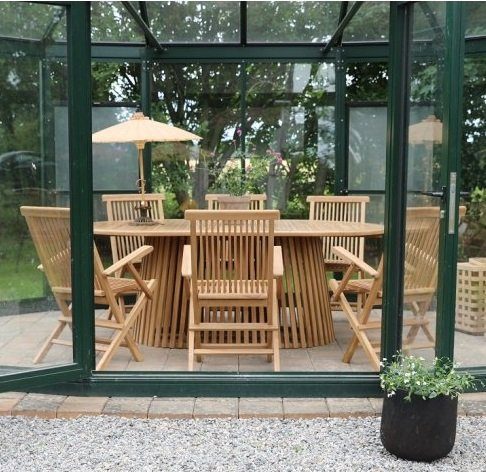 Saltö matgrupp för uteplatsen med ett stort runt matbord i massiv teak, tillsammans med Saltö karmstolar. En modern kombination på uteplatsen.