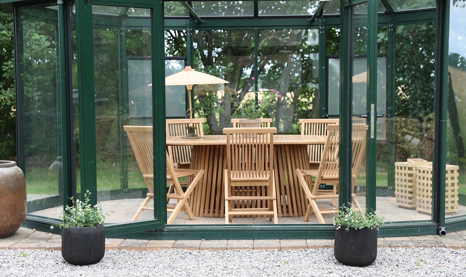 Saltö matgrupp för uteplatsen med ett stort runt matbord i massiv teak, tillsammans med Edenryd matstolar. En modern kombination på uteplatsen.