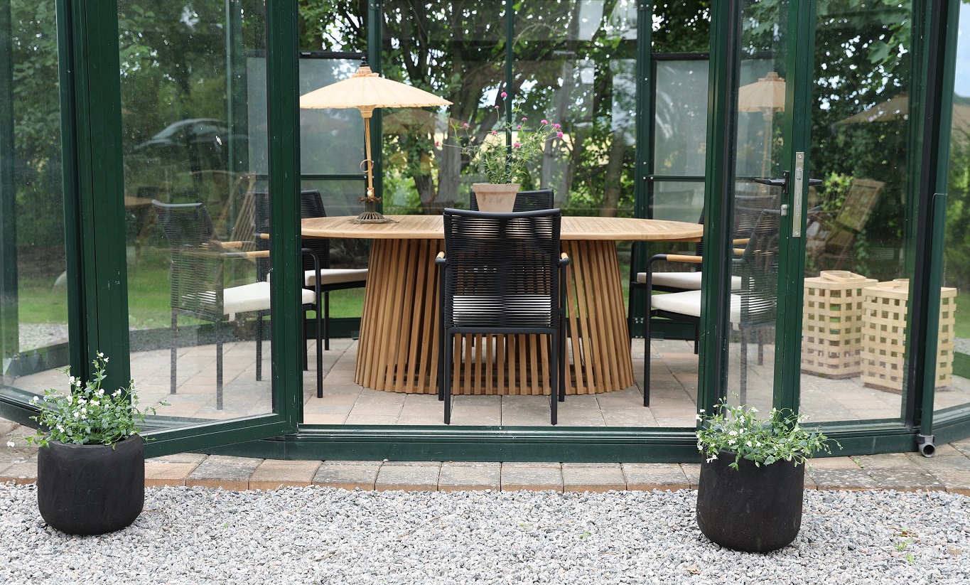 Saltö matgrupp för uteplatsen med ett stort runt matbord i massiv teak, tillsammans med Skanör karmstolar i svart rep, svartlackad ben och en beige skön sittdyna. En modern kombination på uteplatsen.