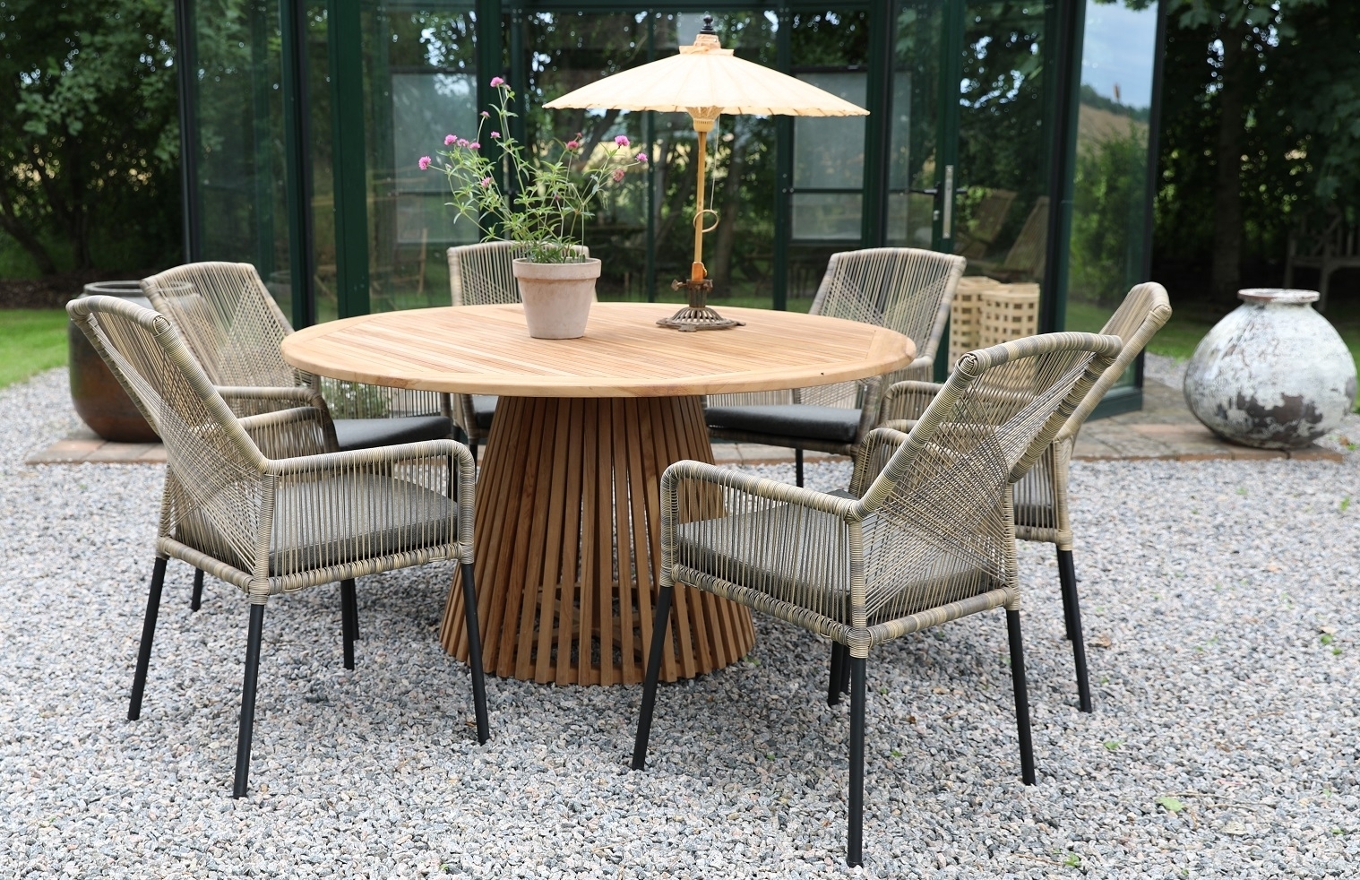 Saltö matgrupp för uteplatsen med ett stort runt matbord i massiv teak, tillsammans med Ystad karmstolar i tvinnad beige konstrotting, svartlackad ben och en grå skön sittdyna. En modern kombination på uteplatsen.