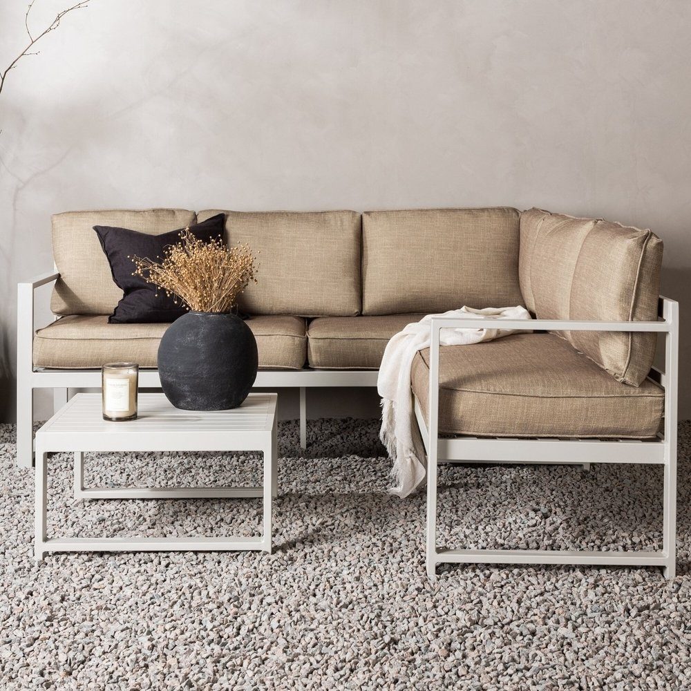 Hörnsoffan från serien Salvador passar perfekt både i uterummet och på uteplatsen! Stommen i raka former är tillverkad i vit pulverlackerad metall och har integrerade armstöd för extra komfort. Mjuka dynor i sandig beige kulör ingår. Här får du en tidlös och slitstark hörnsoffa som förlänger trivsamma kvällar i sommar!