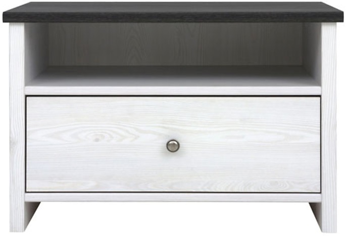 Nätt stilfullt sängbord med en låda med dekorativt handtag i metall samt en underhylla för smart förvaring av exempelvis tidningar och böcker. Toppskivan är stabil och reptålig.