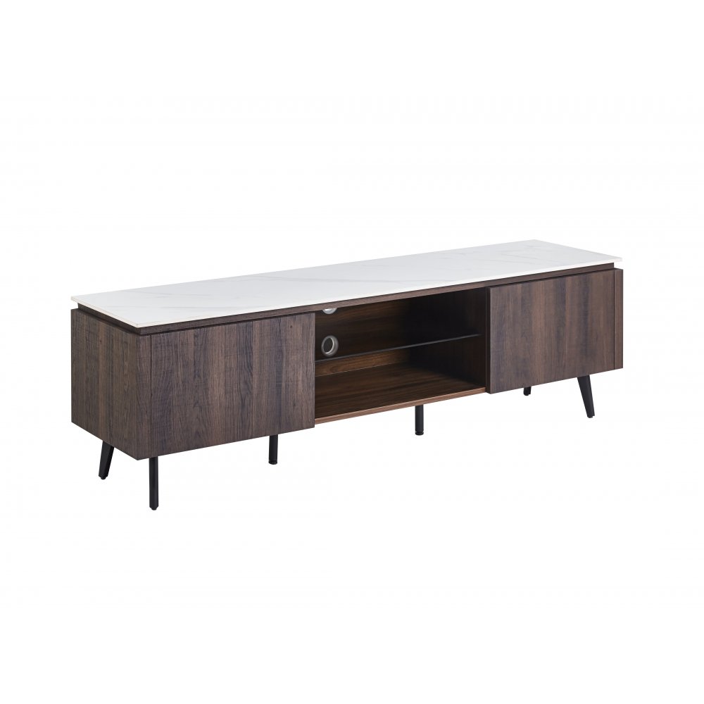 Salvador mediabänk med toppskiva i keramisk sten med vit marmor utförande. Mörk brunbetsad träfoliering. Bra med dold förvaring bakom de två frontluckorna.