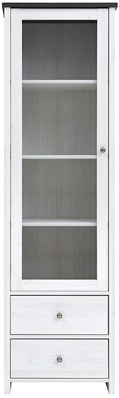 Elegant vitrinskåp i vitt med härdat glas och svart ovanskiva. Här kan prydnadsföremål förvaras synligt. Finns även två lådor undertill med plats till extra förvaring. Handtag i metall.