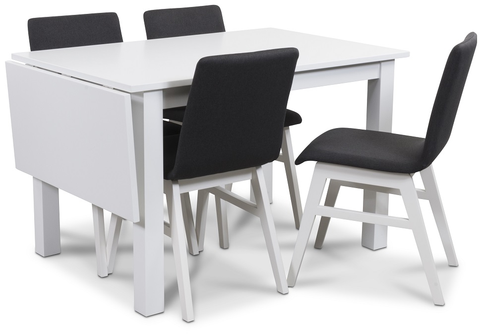 Matgrupp från Skånska Möbelhuset, Klassiskt vitlackat klaffbord 120-160 cm med fyra stycken Molly matstolar med mörkgrå klädsel som ger ett modernt och stilrent intryck!