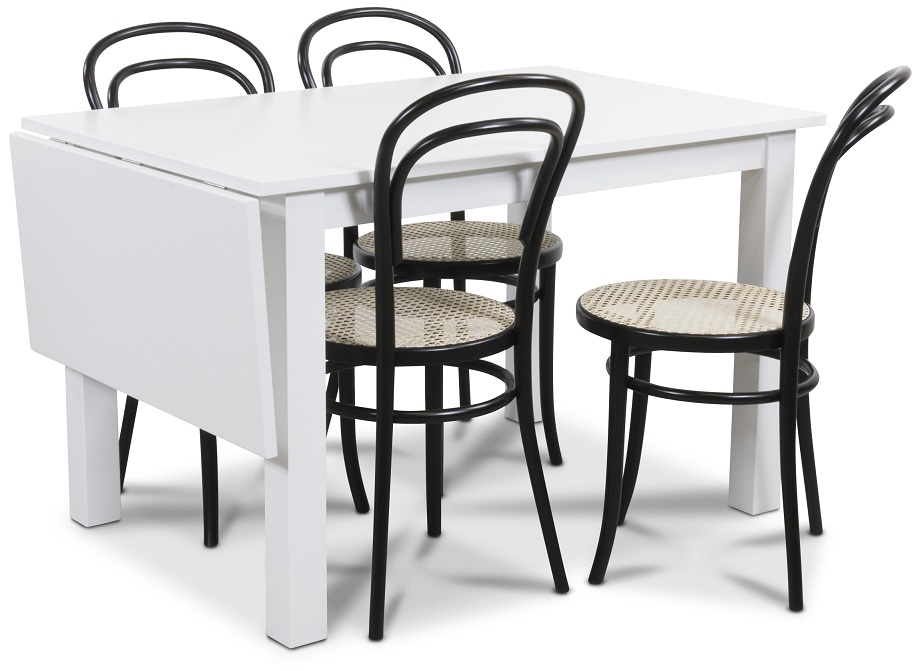 Matgrupp från Skånska Möbelhuset, Klassiskt vitlackat klaffbord 120-160 cm med fyra stycken No 14 matstolar som ger ett Klassiskt och stilrent intryck!