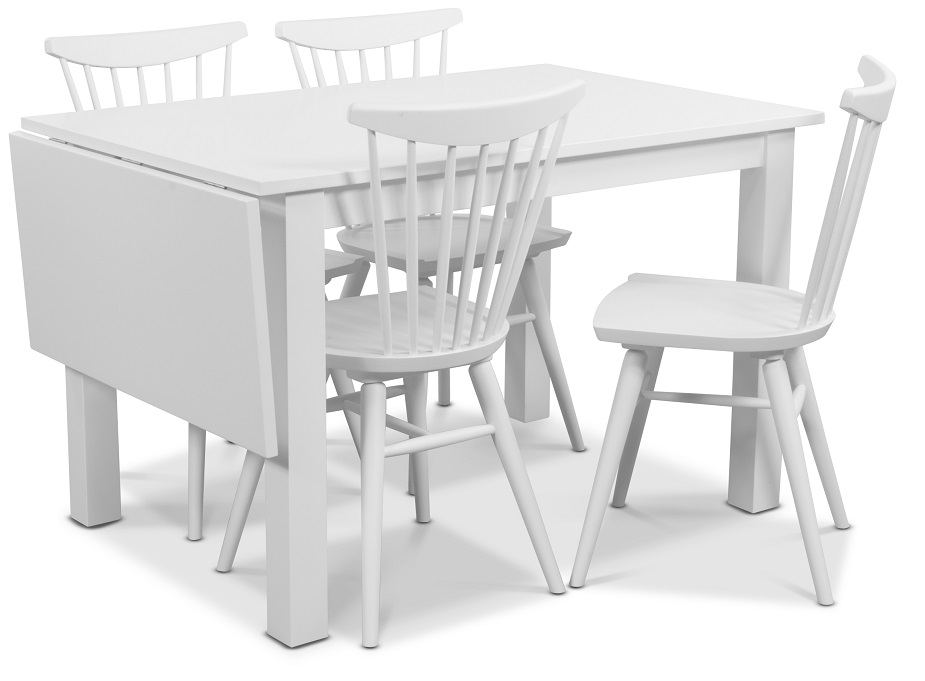Matgrupp från Skånska Möbelhuset, Klassiskt vitlackat klaffbord 120-160 cm med fyra stycken vitlackerade Thor pinnstolar som ger ett klassiskt och stilrent intryck!