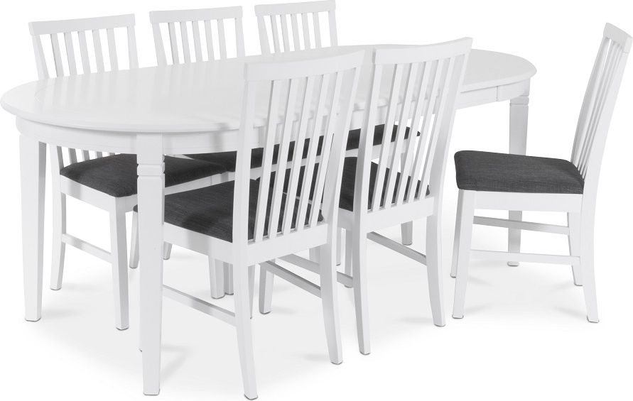 Sandhamn är en Klassisk matgrupp för praktiska behov! Ovalt bord med hela 200 cm längd och 95cm bredd för att få plats med många gäster matgrupp av hög kvalitet! Vitlackat massivt trä!