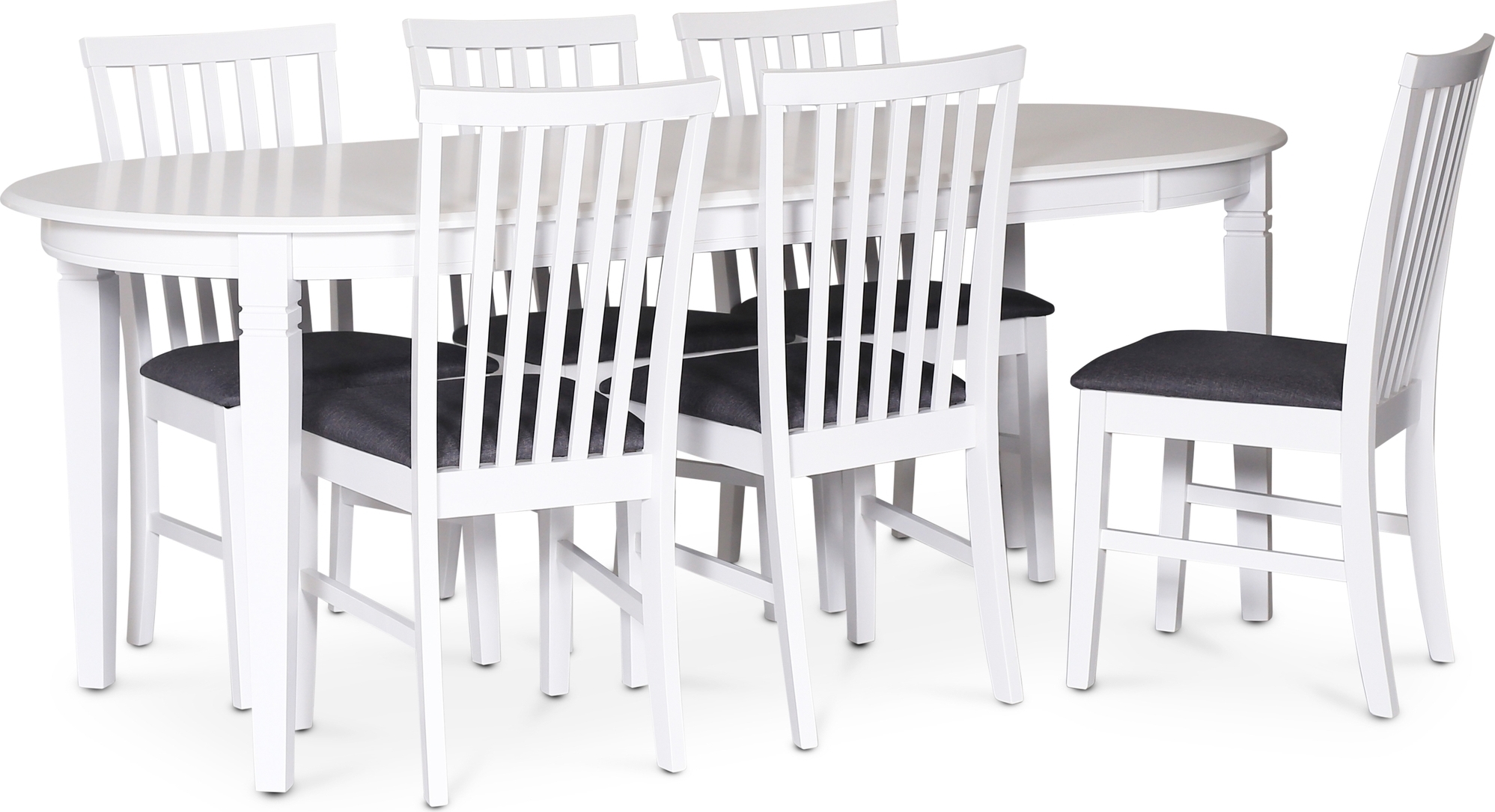 Sandhamn matgrupp Klassiskt utförande. Stilrent ovalt matbord med vitlackade ben och bordsskiva.