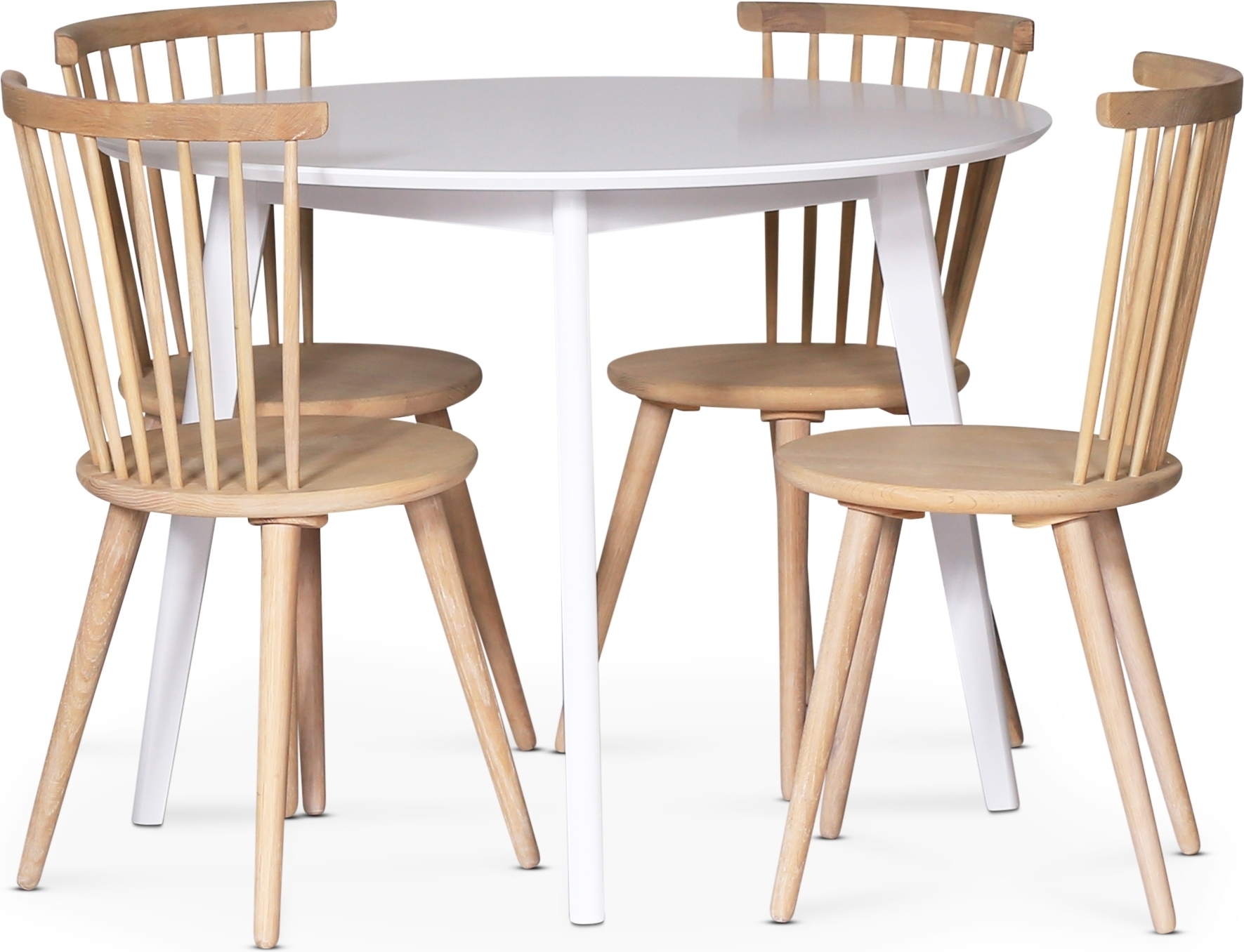 Sandhamn matgrupp Klassiskt utförande. Stilrent runt matbord med vitlackade ben och bordsskiva.