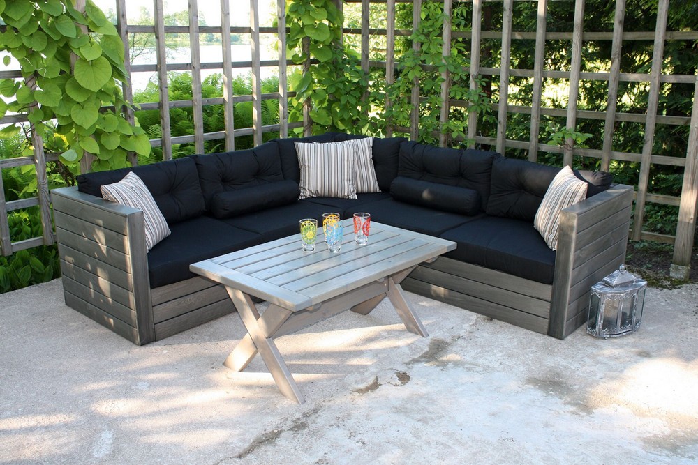 Robust och modern loungegrupp innehållande en hörnsoffa med dynor och bord. Soffan är klädd i grålaserad furu som går bra ihop med naturliga färger på uteplatsen. Sittdynor i svart polyester. Snyggt och modernt soffbord i grålaserad furu, matchar soffan och skapar en enhetlig utegrupp.