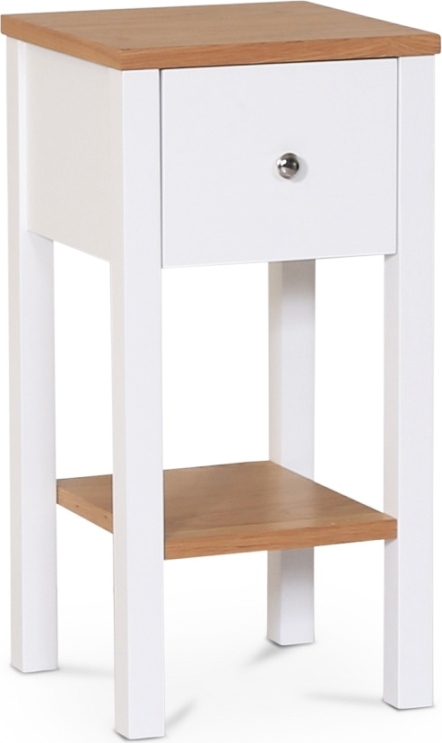 Sandhamn sängbord i en klassisk design med praktisk förvaringshylla och låda. Vitlackad stomme med fanerad ektopp och hylla.