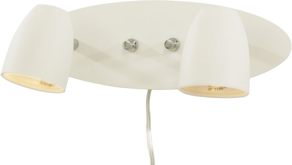 Dubbelspotlight i vit metall. Strömbrytare på plattan. Monteras lätt på plats.