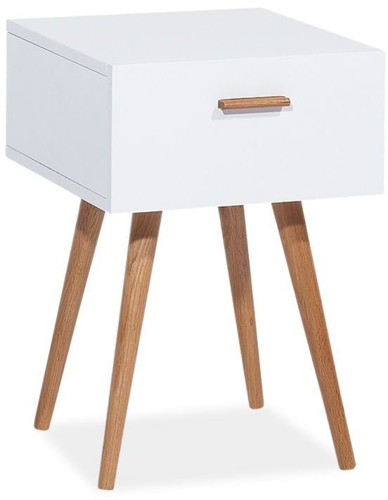 Ett snyggt sängbord med en stilren design. Bordet är tillverkat i trä med en vitlackerad stomme med en praktisk låda för förvaring och ben med ek utförande.