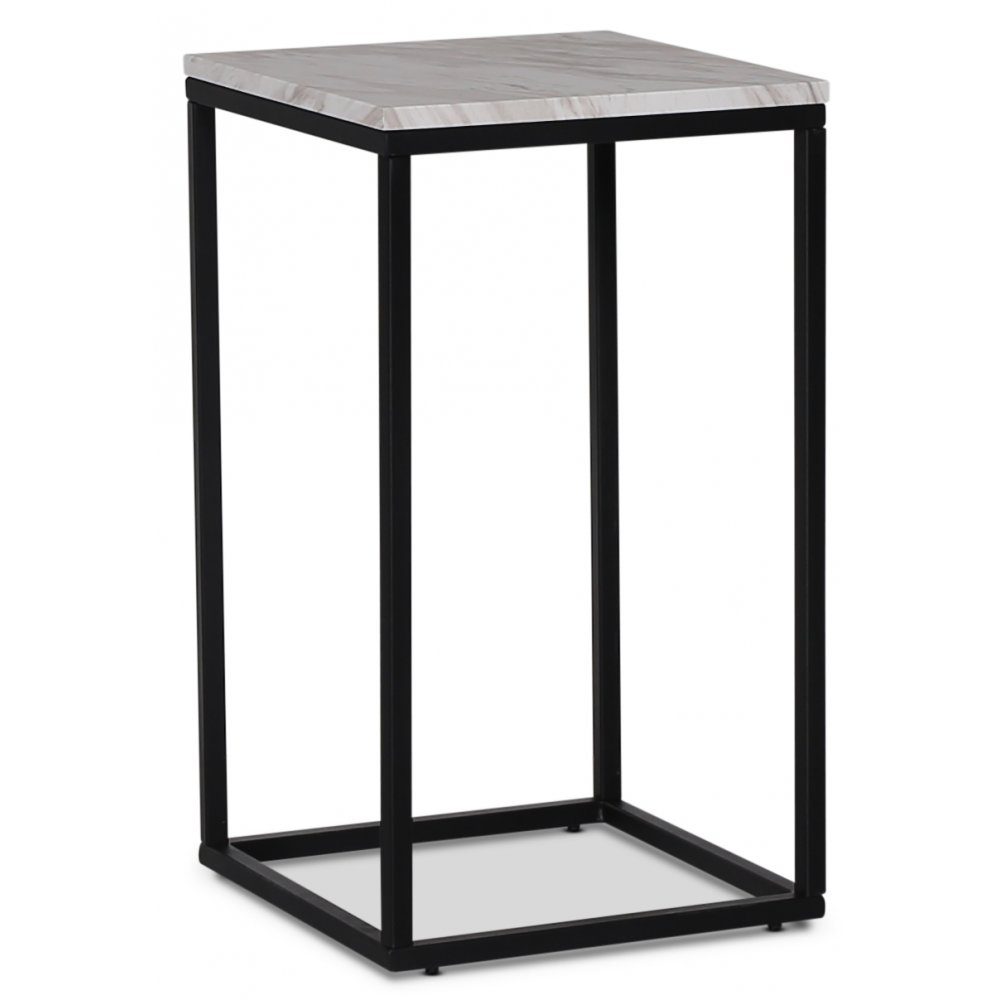 Sängbord med toppskiva i ljus marmorimitation (MDF) med underrede i svartlackad metall. Ett stiligt och prisvärt sidobord med tålig och slitstark yta.
