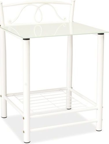 Ett snyggt sängbord med en klassisk design. Underredet är tillverkat av vit metall med ett praktiskt hyllplan för förvaring av exempelvis böcker och tidningar, och bordsskivan är tillverkad av härdat glas.