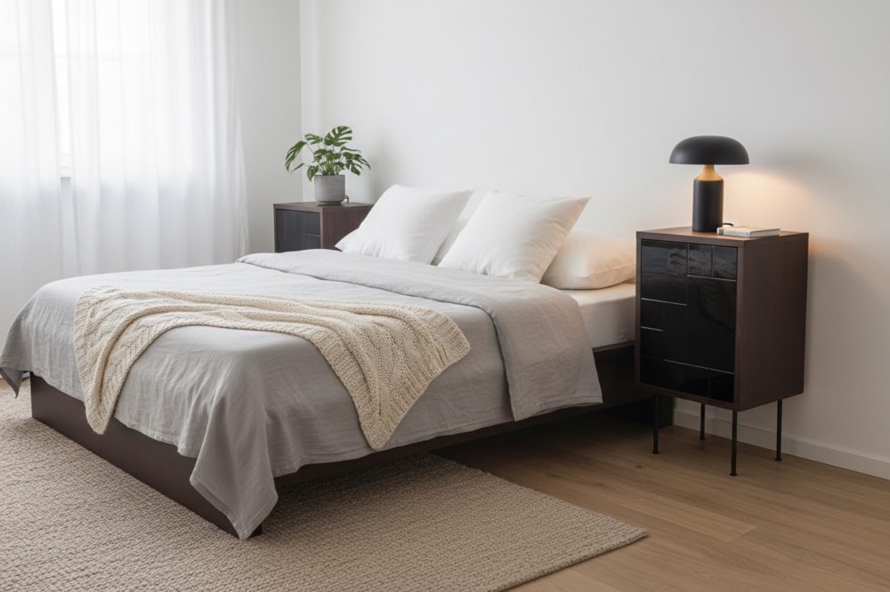 Sängbord Straight i mocca och svart kombinerar varm träkänsla med en modern och grafisk design. Den mörka moccatonen tillsammans med svarta detaljer ger möbeln ett elegant och sofistikerat uttryck som passar både moderna och klassiska sovrum.
