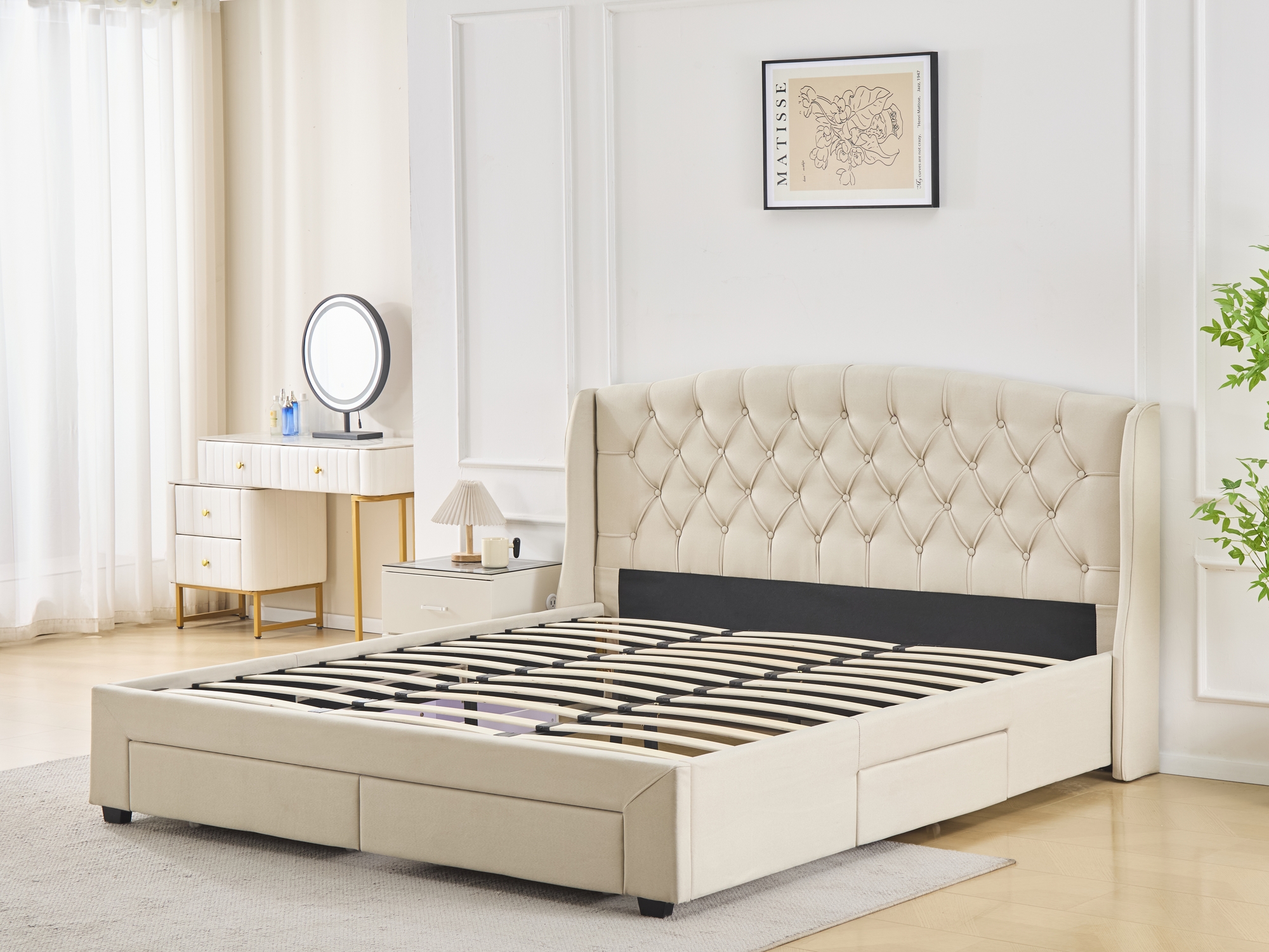 Lady sängram med sänggavel och förvaring. Praktiska förvaringslådor finns inbyggda i sängramen. Komplett med arbetad och detaljrik sänggavel med knappar. Beige mjukt tyg.