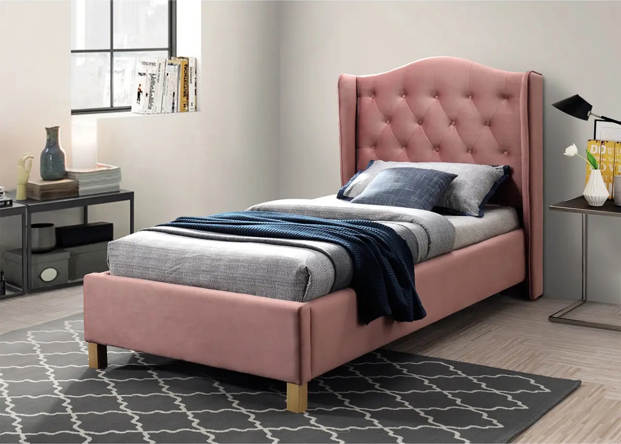 Sängram av trä. Klädd med polyestertyg. Madrass ingår ej.