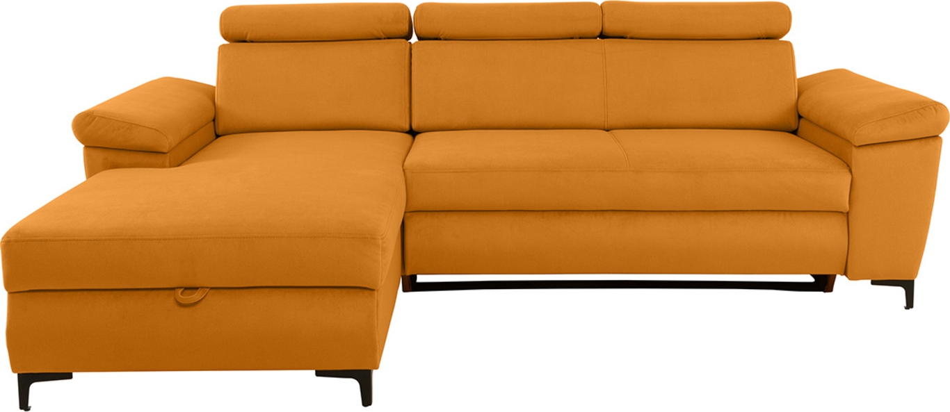 Divansoffa med bäddfunktion, förvaringsutrymme och ställbara nackstöd. Ett av armstöden har dold förvaring.