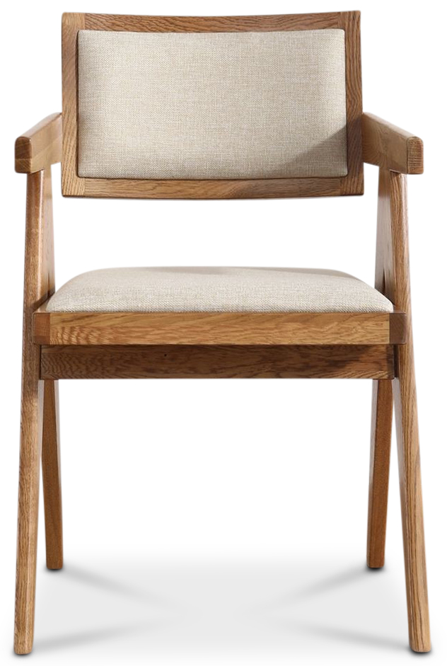 Robust karmstol som finns att välja i flera olika färger. Ramen är av ek i utförande valnöt, sits- och rygg klädd med ett grått linnetyg.