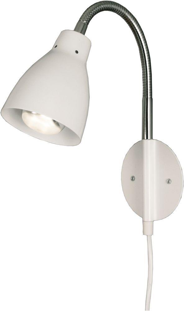 Vägglampa i vit och kromad metall. Monteras lätt på väggen.