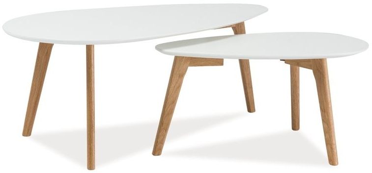 Ett par fina satsbord med en stilren design. Underredet är tillverkat av trä med ek utförande och bordsskivan är av vitlackerad MDF.